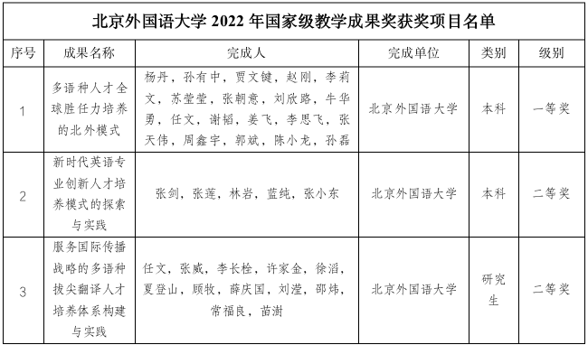 2023年7月,教育部公布2022年高等教育國家級教學成果獎獲獎名單,北外3項成果榮獲高等教育國家級教學成果獎,其中《多語種人才全球勝任力培養的北外模式》榮獲2022年高等教育(本科)國家級教學成果獎一等獎,《新時代英語專業創新人才培養模式的探索與實踐》榮獲2022年高等教育(本科)國家級教學成果獎二等獎,《服務國際傳播戰略的多語種拔尖翻譯人才培養體系構建與實踐》榮獲2022年高等教育(研究生)國家級教學成果二等獎,獲獎等級和數量均實現新突破。
