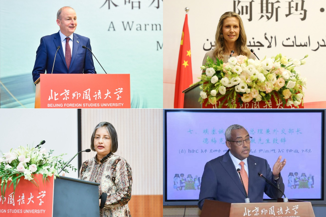 2023年,北外國際交流與合作開啟全新篇章。愛爾蘭副總理兼外交部長米哈爾·馬丁、敘利亞第一夫人阿斯瑪·阿薩德、斯里蘭卡第一夫人麥特麗·維克拉瑪辛、埃塞俄比亞副總理兼外交部長德梅克·梅孔嫩等先后到訪學校,與師生親切交流,引發廣泛反響。毛里塔尼亞伊斯蘭共和國高等教育和科學研究部部長尼昂·馬穆都,北外“新漢學計劃”博士校友、斯里蘭卡交通與公路部長媒體部長兼內閣發言人班杜拉·古納瓦拉特納,白俄羅斯教育部第一副部長亞歷山大·巴哈諾維奇,非盟委員會教育代表團等高端訪問團來校交流。中非大學聯盟交流機制中方秘書處在北外揭牌成立,為中非高等教育發展提供助力,北外國際交流合作水平不斷提升。