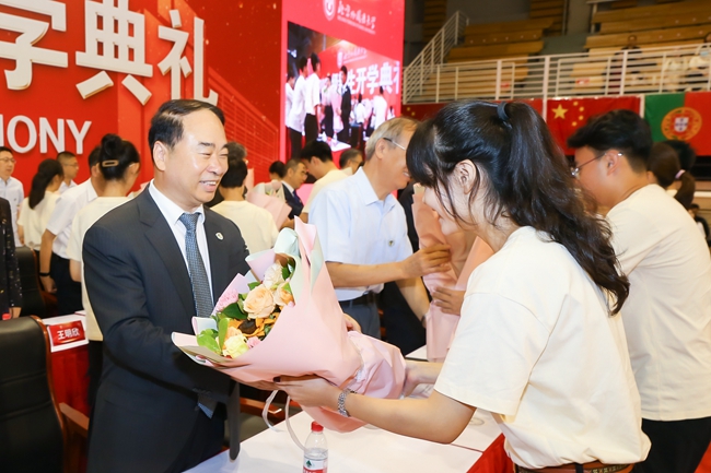 隨后,新生代表向在場教師代表鞠躬并敬獻(xiàn)鮮花,新生領(lǐng)誓代表帶領(lǐng)全體新生宣讀入學(xué)誓詞:銘記兼容并蓄、博學(xué)篤行的北外校訓(xùn),志存高遠(yuǎn)、勤學(xué)力行,敬師愛校、誠以待人,強(qiáng)健體魄、陽光向上,珍惜韶華、奮發(fā)有為,胸懷天下、敢于爭先,不畏艱難、勇?lián)姑?wù)人民、奉獻(xiàn)祖國。
