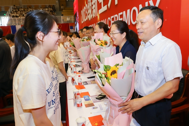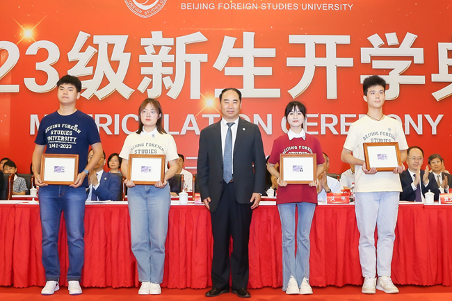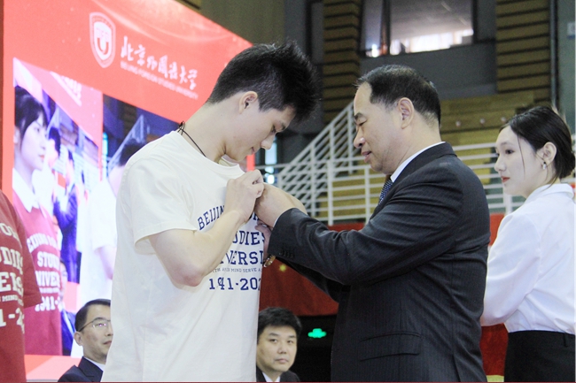 王定華為新生代表們佩戴校徽,并頒發(fā)校園卡。在場的全體新生一同佩戴校徽,正式成為“北外人”,肩負(fù)起“人民需要我們到哪里,我們就到哪里”的北外使命。