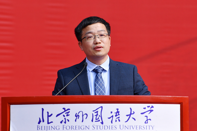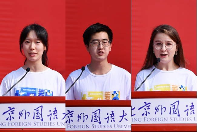 本科新生代表日語學院日語專業李子樂號召同學們以全新的面貌開啟人生新旅程,希望和同學們攜手奮進,做有理想、有本領、有擔當的北外人。英語學院英語筆譯專業政治文獻翻譯方向首屆新生、研究生新生代表李澤暉同學倡導同學們要“游于語言,依于北外,據于中國,志于世界”,將紅色基因不斷傳承,在偉大事業中綻放光彩。留學生代表、中國語言文學學院博士生、來自白俄羅斯的格里沙耶娃(Hryshayeva Katsiaryna)希望努力踐行“兼容并蓄、博學篤行”的校訓精神,成為有真才實學的北外人,為增進中白友誼貢獻自己的力量,希望和同學們一起為人類命運共同體建設做出更多貢獻。