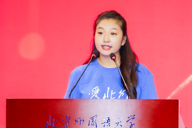 研究生新生代表、國際關(guān)系學(xué)院外交學(xué)專業(yè)的韓江雪結(jié)合在北外六年的學(xué)習(xí)和工作經(jīng)歷,表達(dá)了對新時代外語人才使命的思考,號召同學(xué)們勤奮學(xué)習(xí)、勇?lián)?zé)任,努力成為有家國情懷、全球視野、專業(yè)本領(lǐng)的復(fù)合型人才,為推動世界和平與繁榮貢獻(xiàn)智慧與力量。