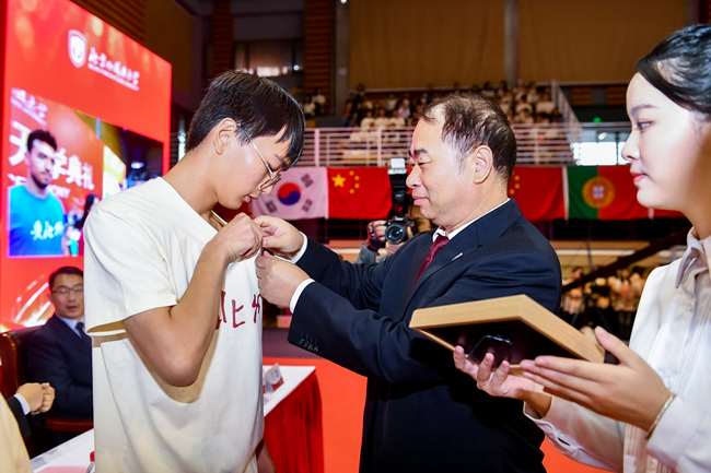 王定華為新生代表們佩戴校徽,并頒發(fā)校園卡。在場的全體新生一同佩戴校徽,正式成為“北外人”,肩負(fù)起“語通中外、道濟(jì)天下”的北外使命和“人民需要我們到哪里,我們就到哪里”的責(zé)任擔(dān)當(dāng)。