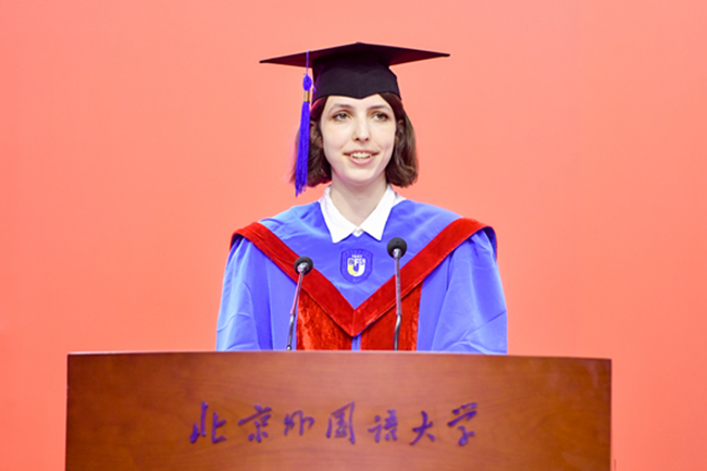 中華文化國際傳播研究院碩士畢業生,來自波蘭的劉艾琳作為留學生代表發言。她回顧了在中國的學習生活點滴與波蘭家鄉的情感連接,感謝北外為留學生提供的多語言的交流平臺和多元的文化氛圍,表達了自己對于中華文化的熱愛,期待與同學們共同為"全球故事"和"未來故事"發出自己的聲音。