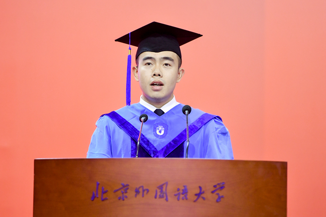 高級翻譯學院廖智超作為碩士研究生代表發言。他圍繞“路”這一意象,回顧了從家鄉啟程到北外經歷學術上的磨礪,到國際舞臺上以翻譯為媒介促進中外交流,再到海外學習拓寬國際視野這一路走來的種種,表示在北外的學習激發了自己勇于探索、不斷超越的追求。他呼吁同學們積極選擇挑戰之路,不忘初心,勇擔時代使命,為促進全球理解與構建人類命運共同體作出不懈努力。